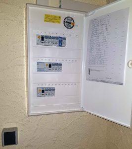Wir haben im Zuge der Elektroinstallation einen neuen Sicherungskasten bekommen, wir haben nun einen Hauptschalter, der außerhalb des Sicherungskastens liegt und es wurden FI-Schutzschalter und neue Sicherungen eingebaut. Bei dieser Gelegenheit haben wir die Stromkreise neu aufgeteilt.